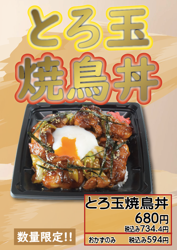 【新商品】とろ玉焼鳥丼6 11月, 2025 in 新商品 by 担当者 やわらか若鶏をスチーム焼きをし、濃厚な焼き鳥ダレでからめ温泉玉子を添えました。とろっとした玉子にやわらか焼き鳥間違いのない味です ぜひ ご利用ください